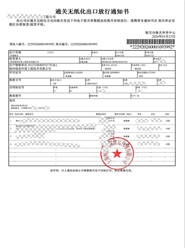 Tietojen mukaan tämän toimituksen aikataulu oli sekä tiukka että erittäin tehokas. 22. päivänä laitteet noutettiin onnistuneesti ja lastattiin välittömästi alukseen samana päivänä. Myöhemmin rahdinkuljettaja lähti onnistuneesti matkaan 26. päivänä ja kuljetti laitteet Kambodžaan vesiväylää pitkin. Tämä toimitus ei ainoastaan osoita Lvquan Environmentalin erittäin tehokkaita toteutuskykyjä rajat ylittävässä logistiikassa, vaan myös sen johtavaa teknologista asemaa painoteollisuuden jätekaasujen käsittelyssä.