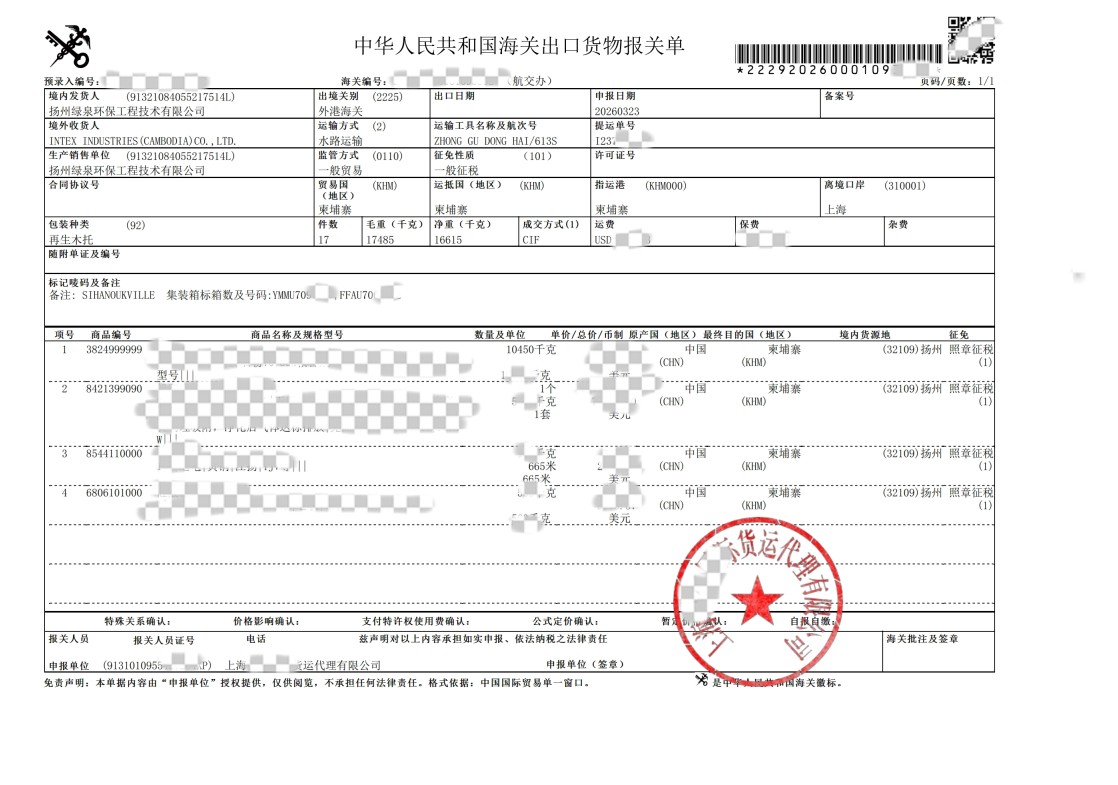 Katso yksityiskohdat[Phnom Penh, Kambodža, 22. maaliskuuta 2026] — Lvquan Environmental Protection Engineering Technology Co., Ltd. sai äskettäin onnistuneesti päätökseen merkittävän rajat ylittävän toimituksen toimittamalla joukon kehittyneitä tulostuspakokaasujen käsittelylaitteita kambodžalaiselle asiakkaalleen INTEX INDUSTRIES (CAMBODIA) CO., LTD.